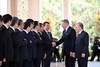 Қароргоҳ олдидаги майдонда фахрий қоровул саф тортди. Ўзбекистон Республикаси Президенти Шавкат Мирзиёев олий мартабали меҳмонни самимий қарши олиб, шоҳсупага таклиф этди.