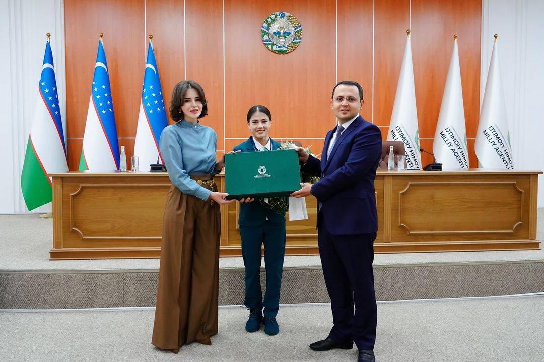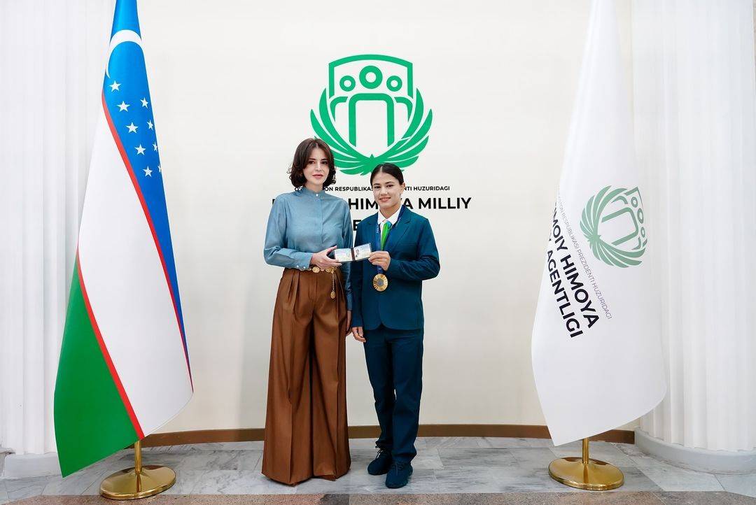 During the meeting with Keldiyorova, the head of the Agency, Mansurbek Ollayarov, and his first deputy, Shakhnoza Mirziyoyeva, were present, who congratulated the champion on her appointment to a new post and solemnly handed her an official certificate.