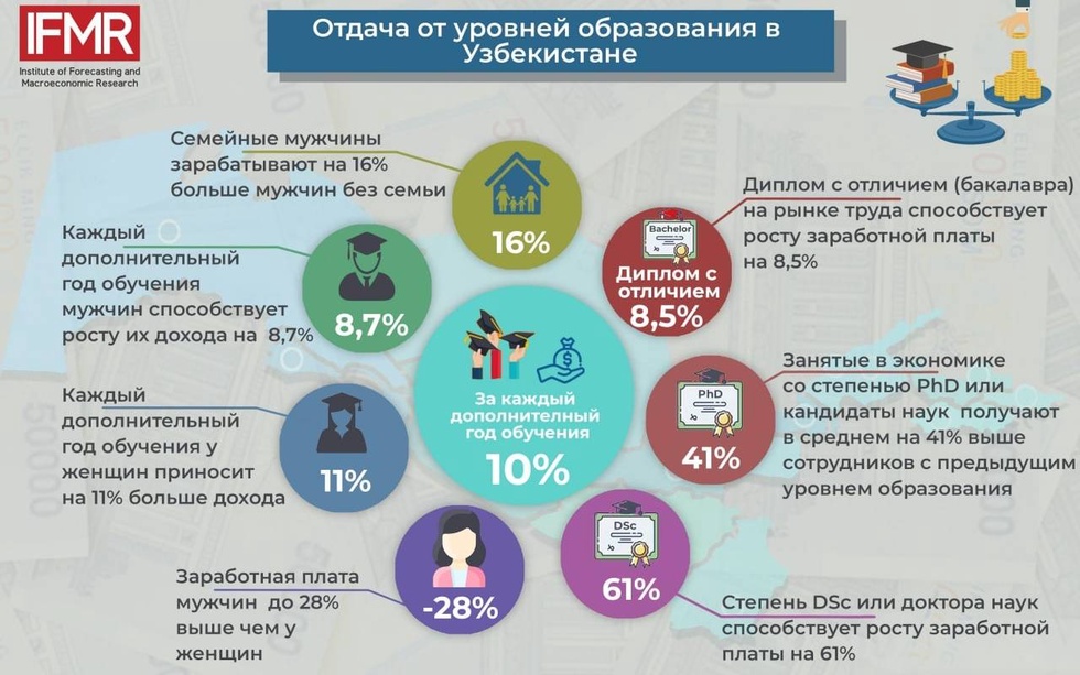 According to the results of the assessment in Uzbekistan, each additional academic year contributes to an increase in the salary of an employee by an average of 10%, which corresponds to the UN assessment on Education, Science and Culture "Education for the benefit of the people of the planet: building a sustainable future for all" / UNESCO.