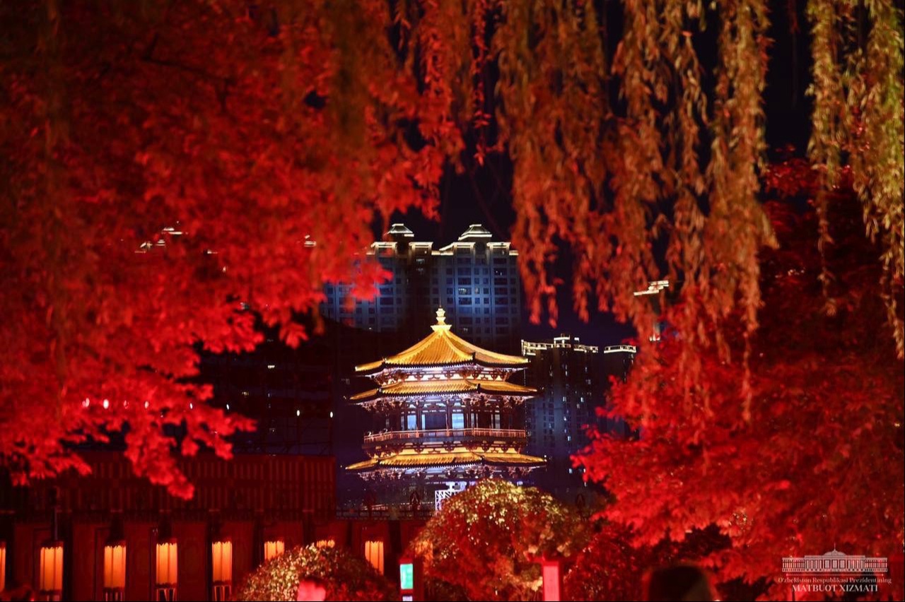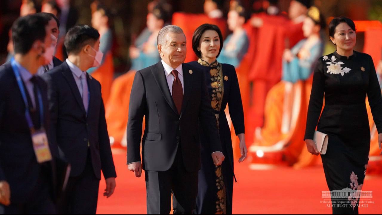 The President of the Republic of Uzbekistan Shavkat Mirziyoyev and his spouse were solemnly welcomed by the President of the People’s Republic of China Xi Jinping and his spouse.