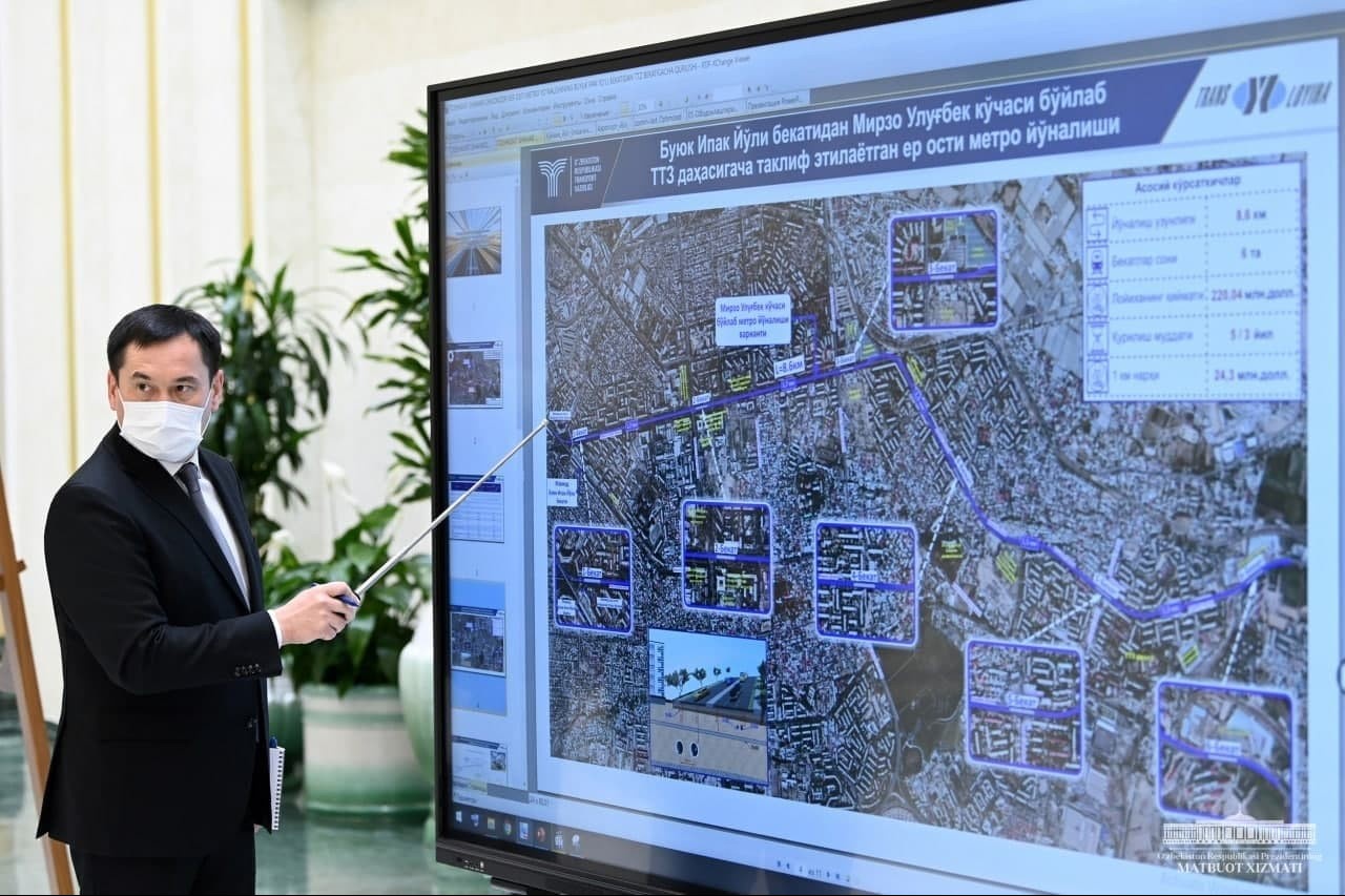 The relevant project proposals were considered at the presentation. Two options for laying an underground line are being worked out – through Mirzo Ulugbek Street or Buyuk Ipak Yuli Street. According to preliminary estimates, in the first case, the length of the line will be 8.6 kilometers, carrying capacity – 62 thousand passengers per day. In the second case, the length of the route will be 8 kilometers, carrying capacity – 55 thousand people per day. The construction work is expected to last 5 years.