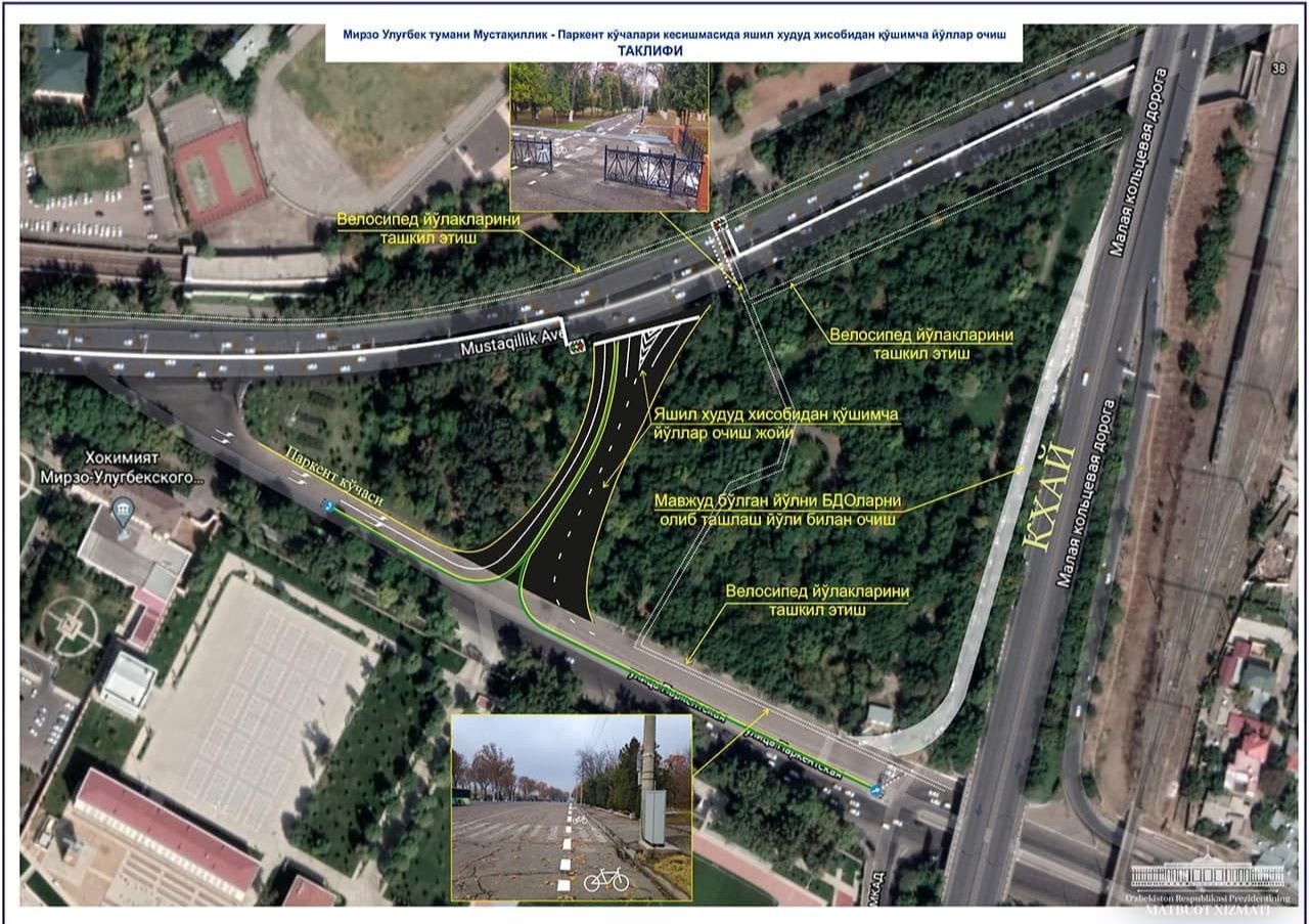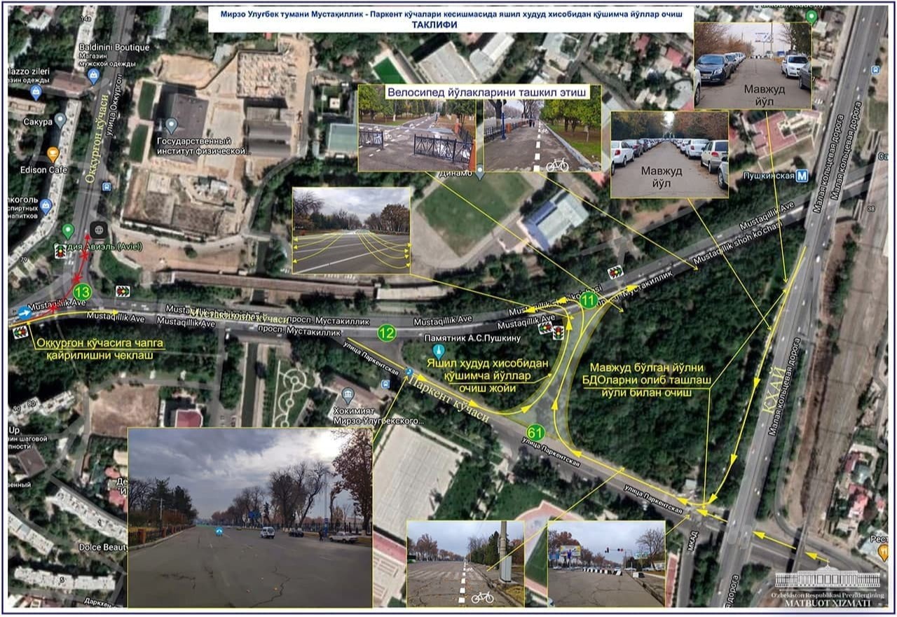 Relevant solutions have been developed to address this issue. It is planned to organize a U-turn along Mustakillik street opposite the Hokimiyat of Mirzo Ulugbek district, a turn from Parkent street to Mustakillik street, as well as an exit from a small roundabout to Parkent street.