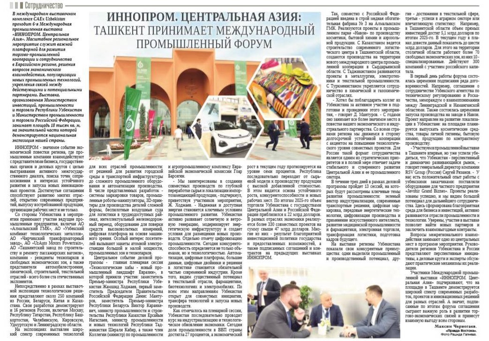 - Хотел бы поблагодарить коллег из Узбекистана за активное участие в подготовке и проведении этого мероприятия, - говорит Д. Мантуров. - С годами оно занимает все более значимое место в повестке нашего экономического и индустриального партнерства. Со всеми странами региона мы движемся в сторону долгосрочной устойчивой кооперации с акцентом на повышение технологического уровня совместных проектов. Для России такой формат сотрудничества является одним из стратегических приоритетов и в полной мере отвечает задаче стабильного и суверенного развития Центральной Азии и ее промышленного сектора.