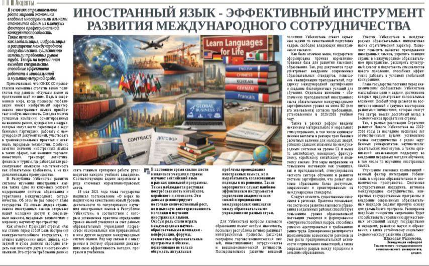 В Республике Узбекистан развитие системы изучения иностранных языков также одно из ключевых условий модернизации системы образования и укрепления международного сотрудничества. Об этом не раз говорил глава государства. По словам лидера страны, знание иностранных языков открывает нашей молодежи доступ к современным знаниям, передовым технологиям и мировому научному пространству.