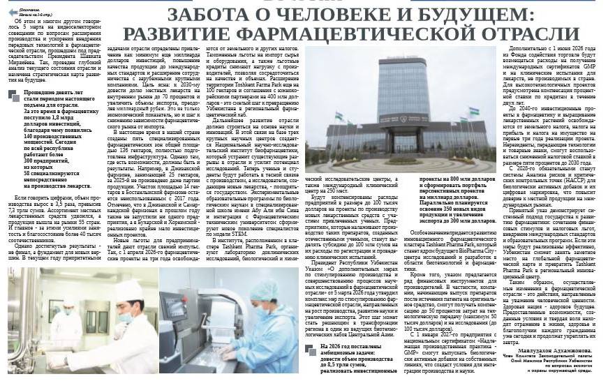 Новые льготы для предпринимателей дают отрасли свежий импульс. Так, с 1 апреля 2026-го фармацевтические проекты на три года освобождаются от земельного и других налогов. Таможенные льготы на импорт сырья и оборудования, а также льготные кредиты снимают нагрузку с производителей, позволяя сосредоточиться на качестве и объемах. Расширение территории Toshkent Farma Park еще на 100 гектаров и соглашения с южнокорейскими партнерами на 400 млн долларов - это смелый шаг к превращению Узбекистана в региональный фармацевтический хаб.