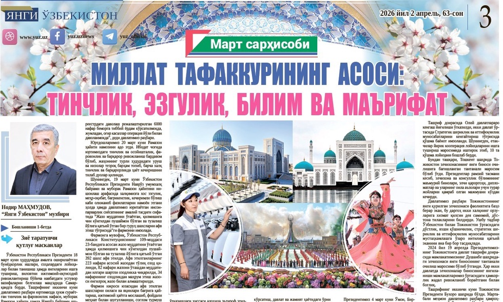 Ming yillar davomida xalqlar oʻrtasida maʼnaviy koʻprik boʻlib kelayotgan Navroʻzning tinchlik, doʻstlik va hamkorlik gʻoyalari bugungi notinch zamonda yanada dolzarb ahamiyat kasb etmoqda. Yurtimizda yashayotgan barcha millat va elat vakillari ushbu bayramni bir boʻlib, shodu xurramlik bilan nishonlamoqda. Ana shunday ahillik va totuvlik yangi Oʻzbekistonni birgalikda barpo etishning eng ishonchli kafolati boʻlib maydonga chiqdi.