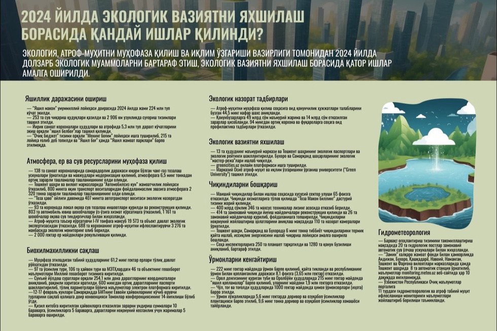 2024-жылы қоршаған орталықты қорғаў тараўына байланыслы нызамшылық ҳүжжетлериниң талапларын бузған 44,5 мың шахс анықланған. Нызам бузыўшыларға 49 млрд сум ҳәкимшилик жәрийма ҳәм 14 млрд сум зыян есапланды. 94 мыңнан аслам кәрхана ҳәм пуқараларға тараўға байланыслы профилактика илажлары өткерилди.