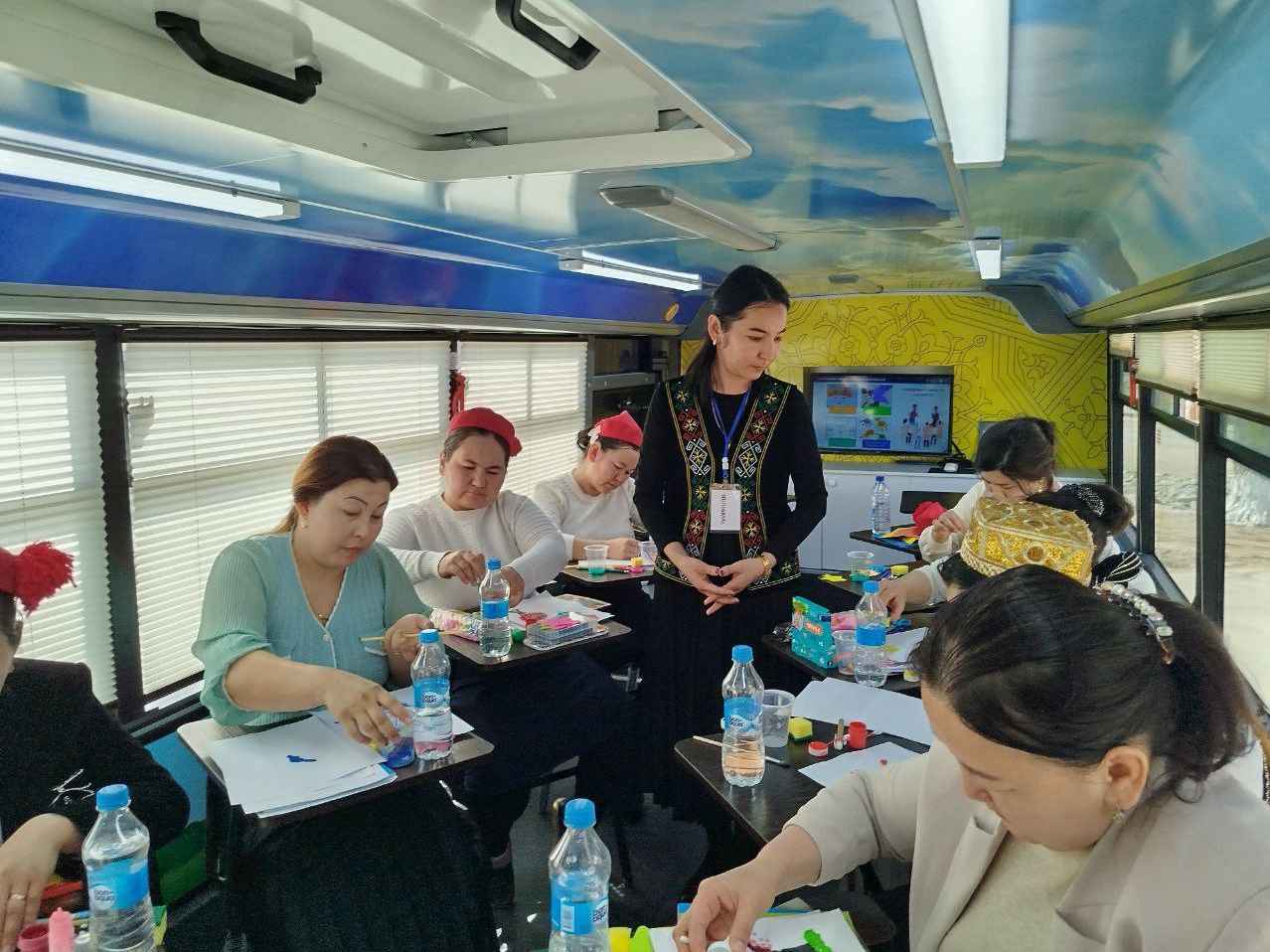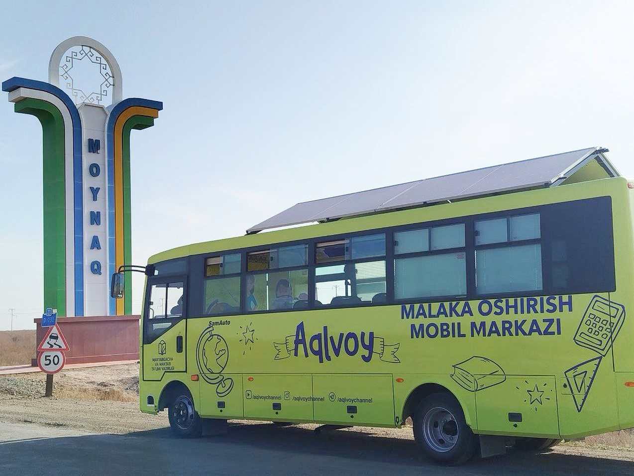 Усы арнаўлы автобус Мойнақ районындағы алыс Ҳәким ата аўыл пуқаралар жыйыны аймағында жайласқан 15-санлы мәмлекетлик мектепке шекемги билимлендириў шөлкеми ҳәм «Нурмуғамбетова Майна» шаңарақлық мектепке шекемги билимлендириў шөлкемлерине барып, бул жердеги педагогларға өзлери жасайтуғын ҳәм ислейтуғын орынларынан узақласпаған ҳалда үзликсиз кәсиплик раўажланыўы, билимлерин жаңалаўы ушын имканият жаратылды.