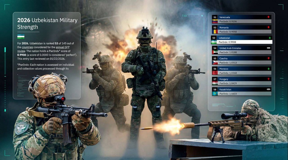 Global Firepower порталы «Global Firepower Index-2026» рейтингин жәриялады. Мағлыўматларға бола, Өзбекстан Қураллы Күшлери 145 мәмлекет арасында 53-орынды ийелеп, өткен жылға салыстырғанда бес текшеге көтерилди ҳәм Орайлық Азияда жетекши болды.