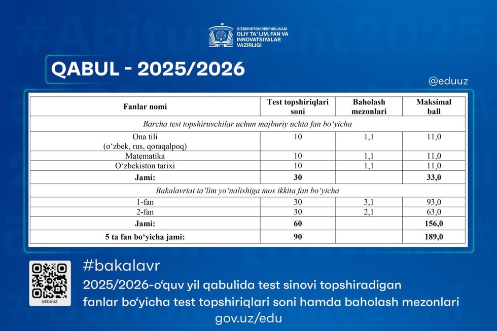 Жоқары билимлендириў, илим ҳәм инновациялар министрлигиниң тийисли буйрығы менен 2025/2026-оқыў жылы ушын республика жоқары билимлендириў мәкемелериниң бакалавриат тәлим бағдарларына сәйкес тест сынағы тапсырылатуғын пәнлер бойынша тест тапсырмаларының саны ҳәм баҳалаў критериялары өткен жылғысы менен қалдырылды.