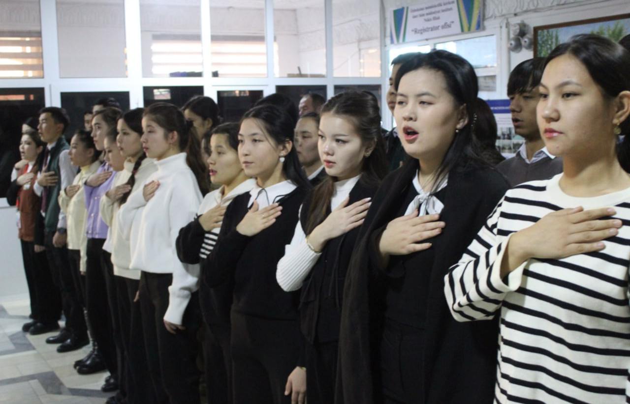 Филиал директоры А.Аяпов, «Халық дөретиўшилиги» факультети деканы Қ.Турдиев ҳәм басқалар шығып сөйлеп, мәмлекетлик нышанлар, соның ишинде, гимнниң әҳмийетине айрықша тоқтап өтти.