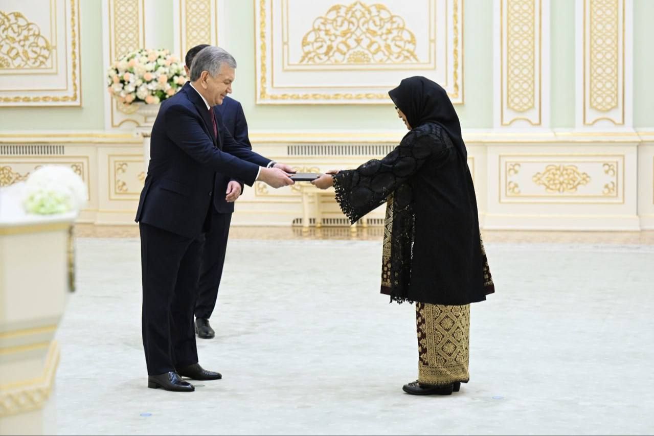 Өзбекстан Республикасы Президенти Шавкат Мирзиёев Греция Республикасының Айрықша ҳәм толық ҳуқықлы елшиси Параскеви Цевелеки, Индонезия Республикасының Айрықша ҳәм толық ҳуқықлы елшиси Сити Руҳайни Жухаятин, Латвия Республикасының Айрықша ҳәм толық ҳуқықлы елшиси Гиртса Яунземс, Франция Республикасының Айрықша ҳәм толық ҳуқықлы елшиси Валид Фук, Россия Федерациясының Айрықша ҳәм толық ҳуқықлы елшиси Алексей Ерхов, Японияның Айрықша ҳәм толық ҳуқықлы елшиси Кэндзи Хирата ҳәм Тәжикстан Республикасының Айрықша ҳәм толық ҳуқықлы елшиси Насриддин Исматуллодан исеним жарлықларын қабыл етти.