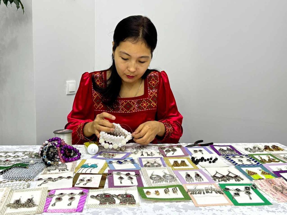 Нөкис қаласындағы Қутлы қоныс мәкан пуқаралар жыйынында жумыс алып барыўшы өнермент-зергер қыз Биби-Марьям Мырзамбетова әне усындай қарақалпақ ҳаял-қызларының миллий тағыншақларын ҳәм безеў буйымларын таярлаў менен шуғылланбақта.