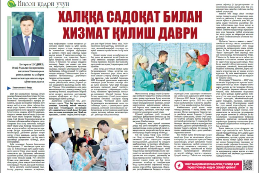 Күшли мәмлекеттен күшли пуқаралық жәмийетине умтылып атырған жаңа Өзбекстан миллий раўажланыўымызда жаңа дәўирге қәдем қоймақта. Мине, усындай әҳмийетли ўақытта парламентимиз ушын да, ҳүкимет ушын да жаңаша ислеў, халыққа садықлық пенен хызмет етиў Президентимиз тәрепинен ең тийкарғы ўазыйпа етип қойылды. Халқымызға садықлық пенен хызмет етиў бойынша ибратлы дәстүрлер қәлиплесетуғын ҳәм тарийхқа мөрленетуғын дәўирди жаратыў болса, мине, усы ўазыйпаны қай дәрежеде орынлайтуғынымызға тығыз байланыслы.