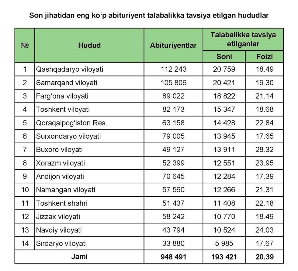 ➖ Ең көп абитуриент студенттікке ұсынылған аймақтар (тұрақты жасайтын аумақтар бойынша):