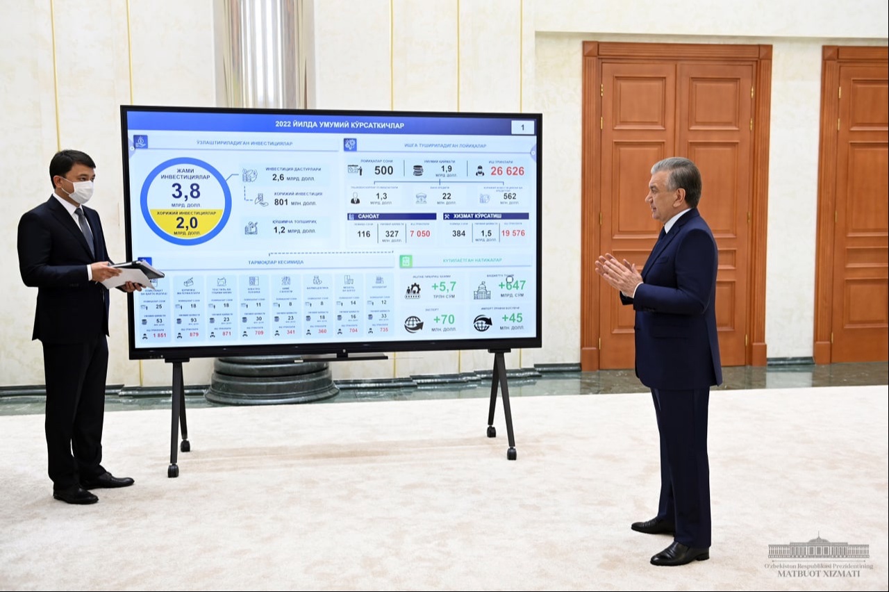 Биыл Ташкентте 4 миллиард долларға жуық инвестициямен 500-ден астам жоба жоспарланған. Бүгінгі таңда 1,5 миллиард доллар игерілді. 120 млн долларды құрайтын 71 жоба іске қосылып, 5 мыңнан астам жұмыс орны ашылды. Құны 2,3 миллиард доллар болатын тағы 450 жоба жүзеге асырылуда.