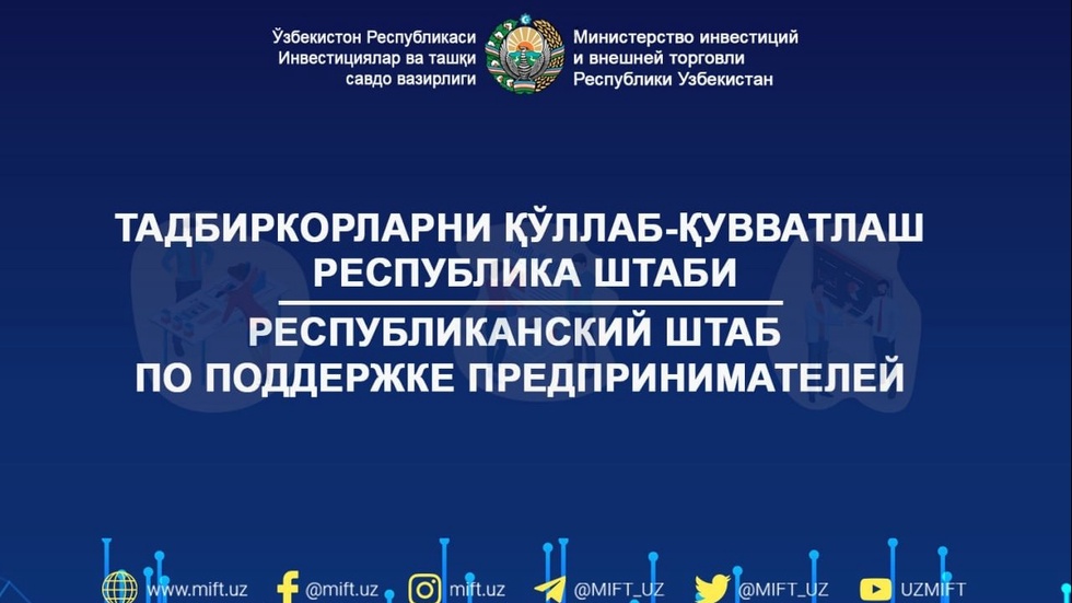 Сондай-ақ өтініштер Өзбекстан Республикасы Сауда-өнеркәсіп палатасының байланыс орталығына одан әрі жедел түрде Бас кеңсеге жіберу үшін қабылданады, деп хабарлайды Инвестициялар және сыртқы сауда министрлігінің баспасөз қызметі. Қосымша ақпарат хабарлама арқылы байланысу үшін төмендегі сілтемеде де берілген.