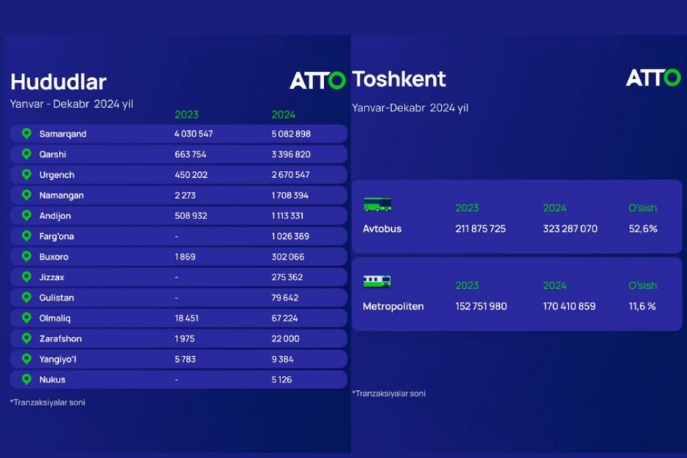 Сондай-ақ автобустардағы мобильді QR-төлемдер 177,4 пайызға, метрода QR-төлемдері 157,6 пайызға өскен. Ташкентқаласында автобустардағы транзакциялары 52,6 пайызға өскен. Метрополитенде өсу біраз төмен – 11,6 пайызды құраған.