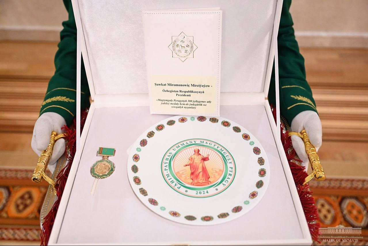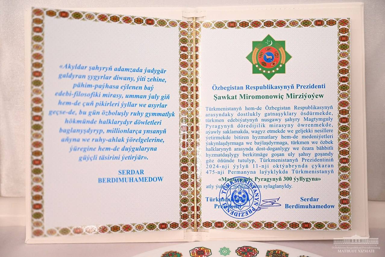 Ақын әрі ойшыл Махтымқұлы Пырағының мерейтойына арналған халықаралық форумның соңында Өзбекстан Республикасының Президенті Шавкат Мирзиёевті марапаттау рәсімі өтті.