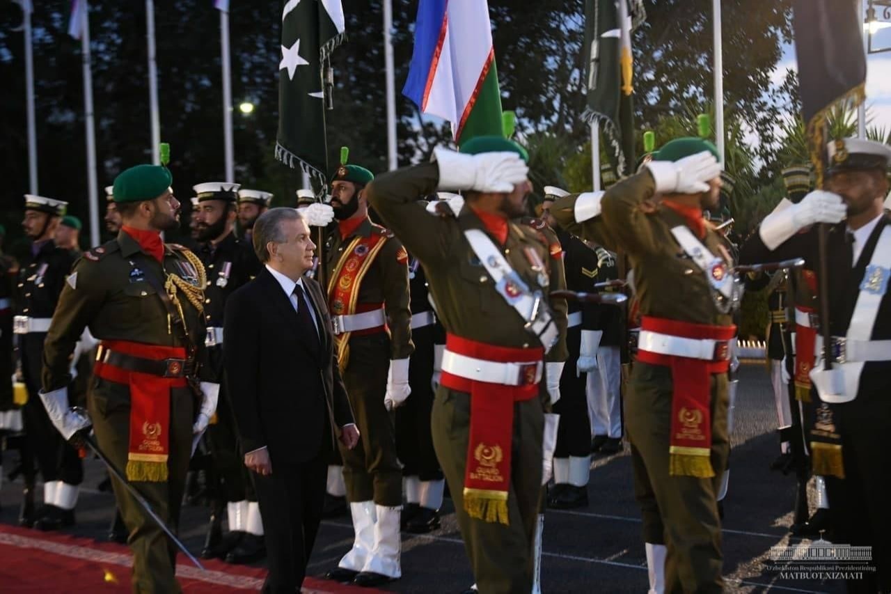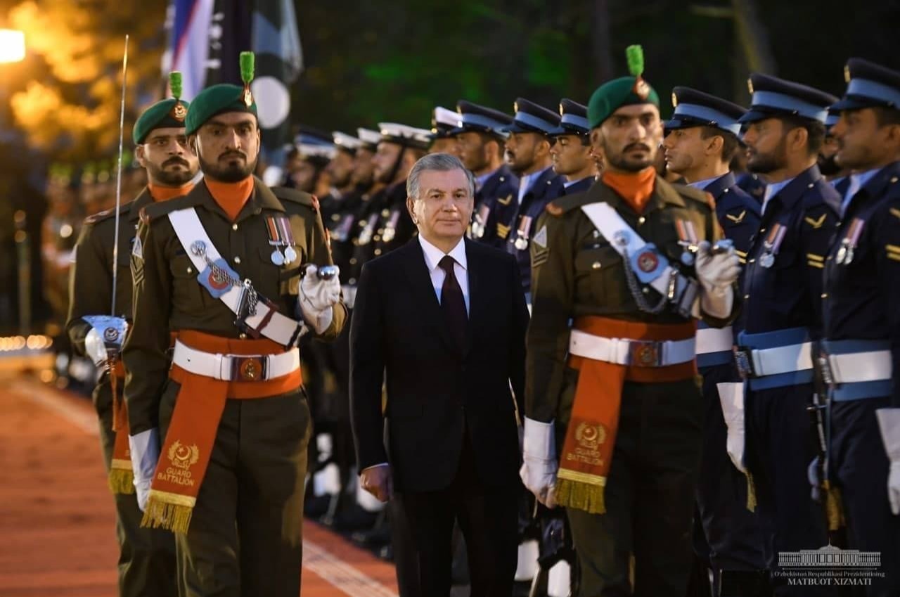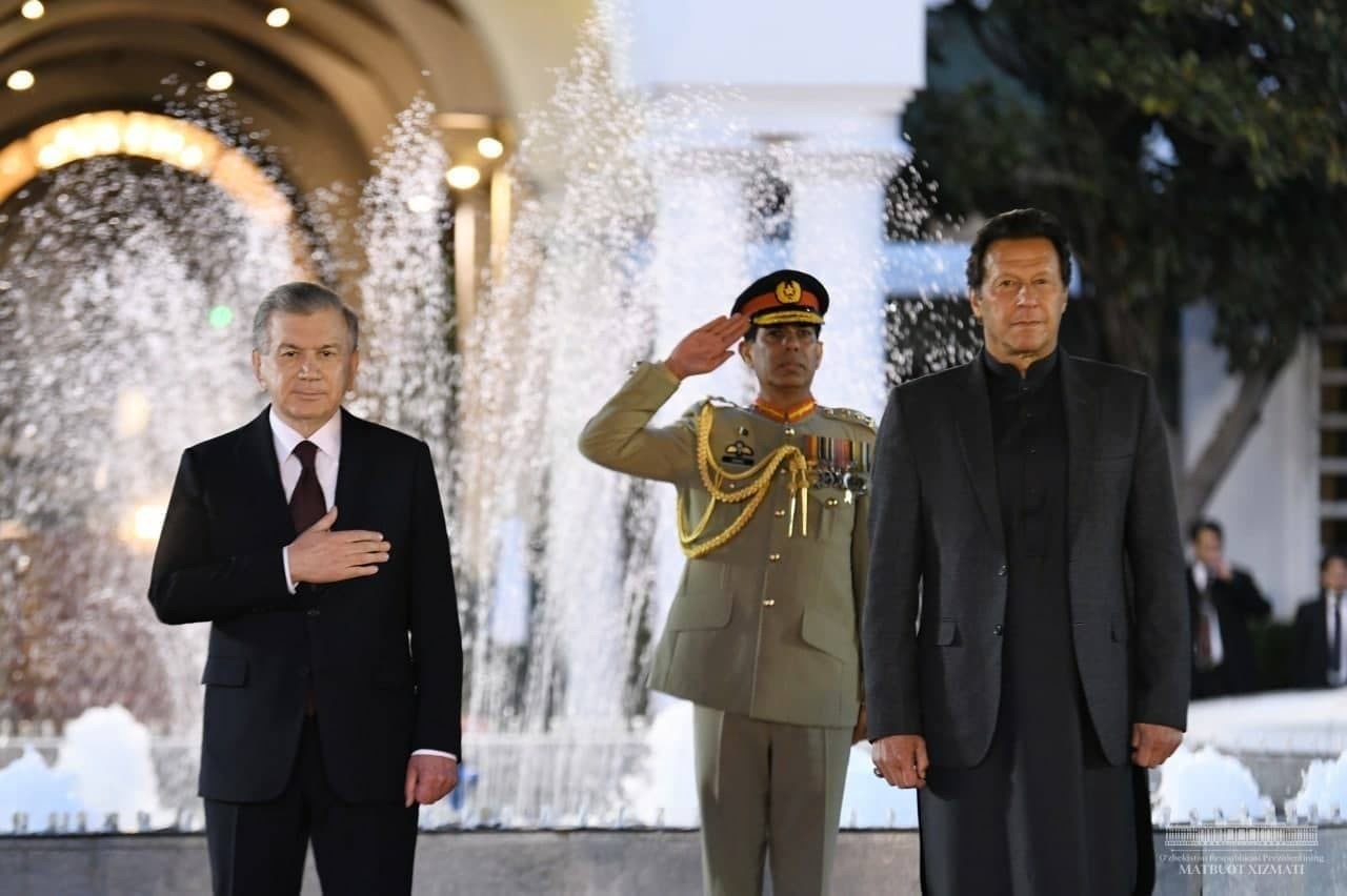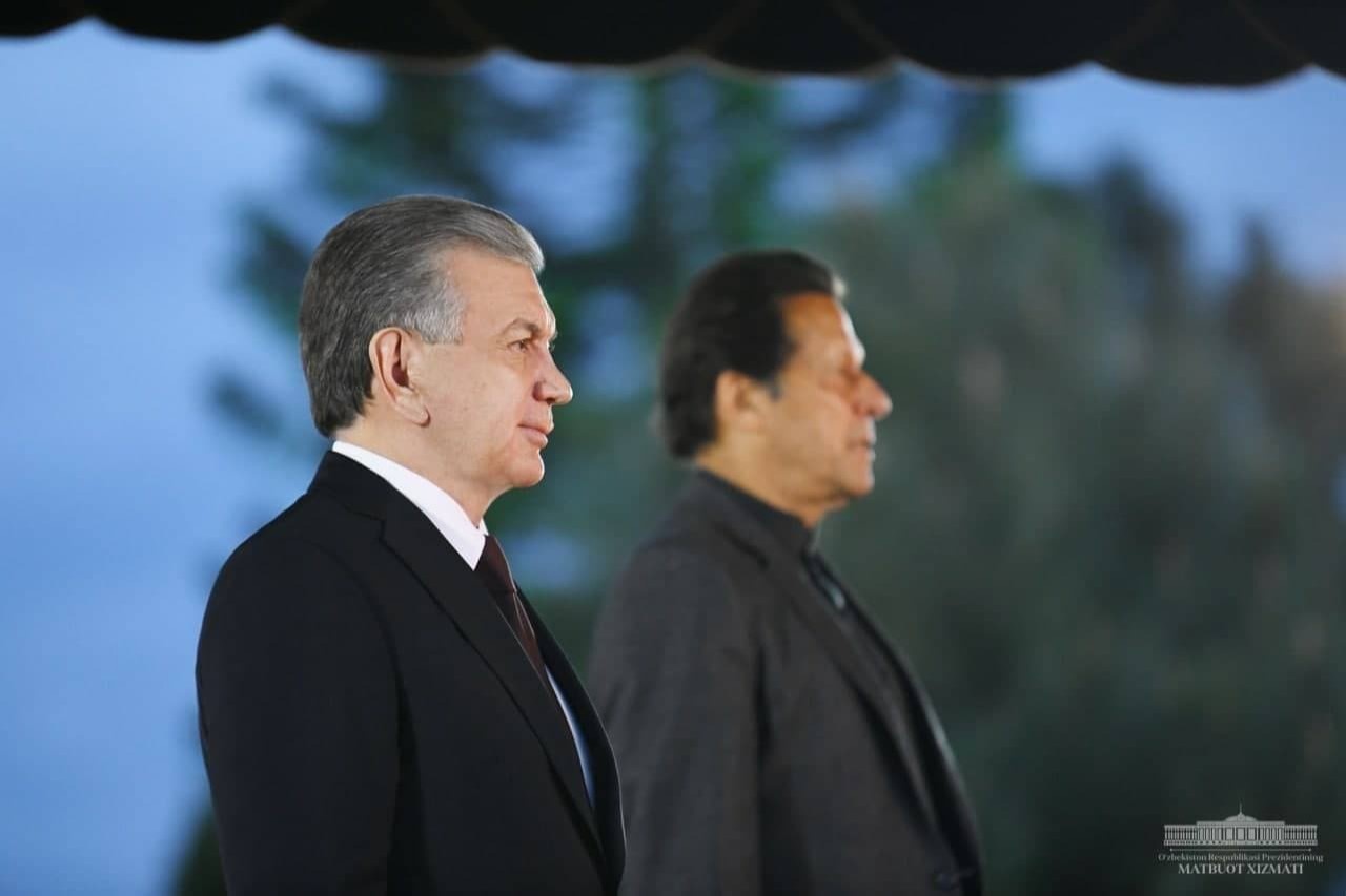 Онда, Шавкат Мирзияев пен Имран Хан сап түзеген құрметті қарауыл алдынан өтіп, тұғырға көтерілді. Өзбекстан мен Пәкістанның мемлекеттік әнұрандары шырқалды.