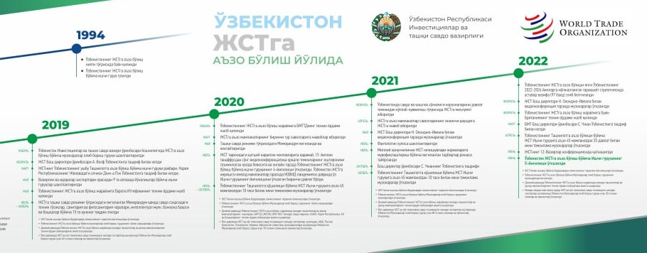 Осыған байланысты Инвестициялар және сыртқы сауда министрлігі жаңа форматтағы смарт-релиз– инфографикаға дайындалып, онда Өзбекстанның бүгінгі күнге дейін осы маңызды үдерісте атқарған жұмысының ауқымын толық көрсетуге тырысты, деп хабарлайды Инвестициялар және сыртқы сауда министрлігінің баспасөз қызметі.