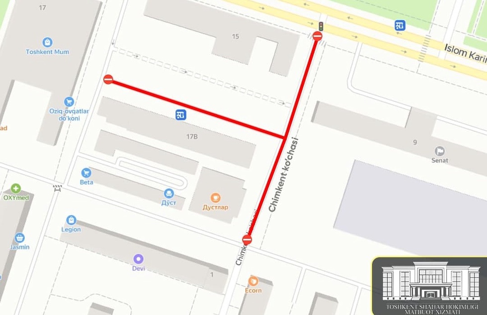 Жол жөндеу істеріне қатысты 7 октябрь күні сағат 16:00-ден — 1 ноябрь күні сағат 20:00-ге дейін Ташкент қаласының Мирабад ауданы, Ташкент “МУМ” автобекеті және Шымкент көшесінің қиылысында транспорттардың қозғалысы уақытша тоқтатылады, деп хабарлайды Ташкент қаласы әкімінің ақпарат қызметі.