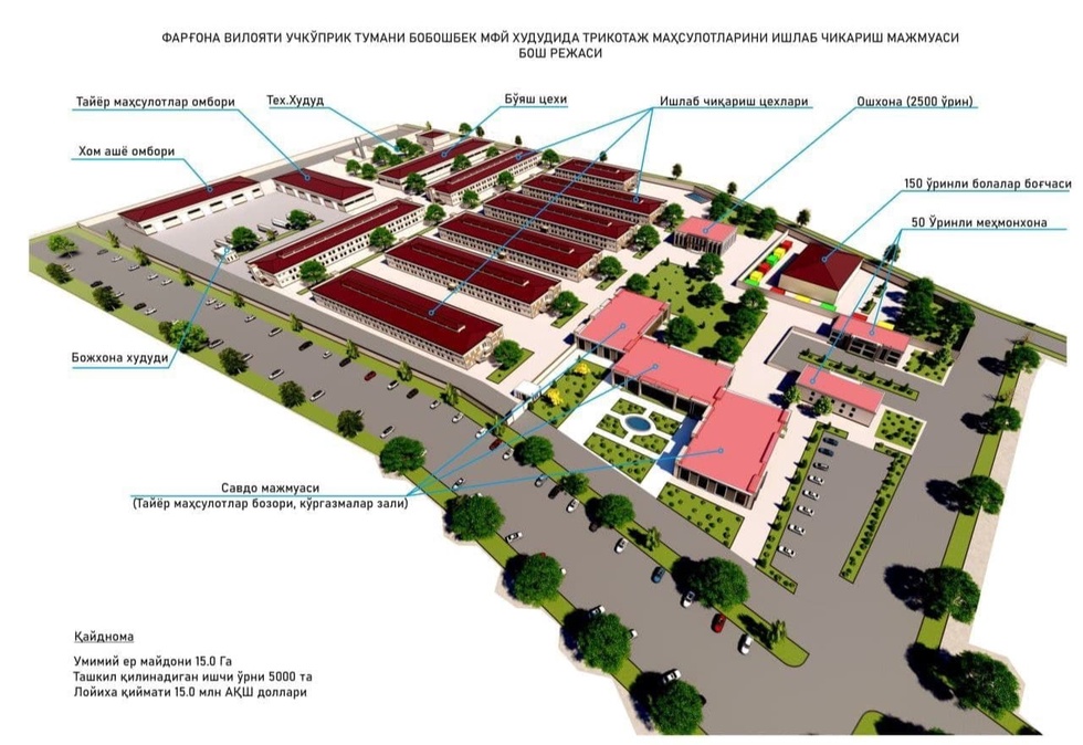 Қаулыда, жеңіл өнеркәсіп саласының әлеуетін одан әрі арттыру, экспортқа сай өнімдерді өндіру көлемін кеңейту, жүргізілген реформаларға және заман талабына толық жауап беретін жеңіл өнеркәсіп орталығын ұйымдастыру мақсатында  Экономикалық  даму және кедейлікті төмендету министрлігі, Ферғана облысы әкімшілігі және  “Микрокредитбанк” АТБ ұсынысы негізінде жеңіл өнеркәсіп өнімдерін өндіру, логистикалық сауда кешенін ұйымдастыру белгіленді.
