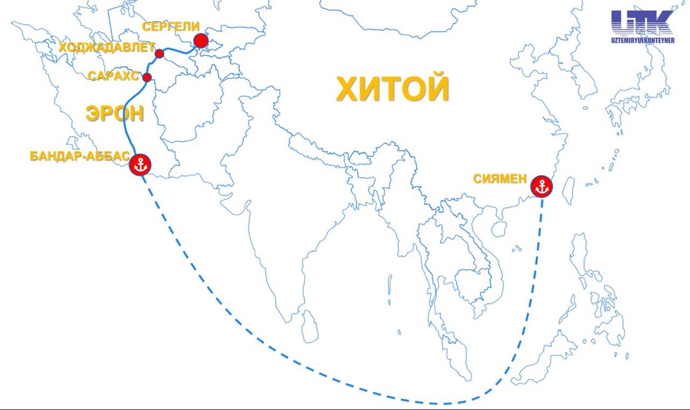 Құрамында тұрмыстық техникалық жүктері бар контейнерлер (тоңазытқыштар, кір жуғыш машиналар, газ плиталары) Қытайдан теңіз арқылы Бандер-Аббас портына әкелінеді, Иранның Бандер-Аббас портындағы теміржол платформаларына тиеп, Түркіменстан арқылы Өзбекстанға келеді.