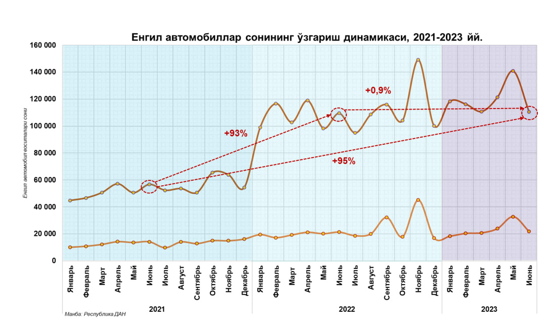 Умуман олганда, июнь ойида сотилган автомобиллар сони 123 мингтани ташкил этиб, май ойига нисбатан 21%га сезиларли пасайиш ва ўтган йилнинг июнь ойига нисбатан 2,6%га ўсиш кузатилди.