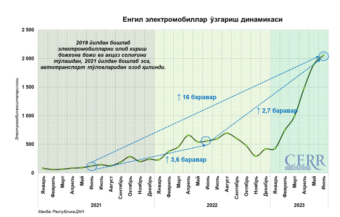 2023 йилнинг биринчи ярмида электромобиллар савдоси 7,6 мингтани ташкил этиб, йиллик ўсиши 1,7 баравар кўпайди. Шу билан бирга, 2-чоракда 5,4 минг дона электромобил сотилган бўлиб, бу ўтган йилга нисбатан 2 баравар кўп.