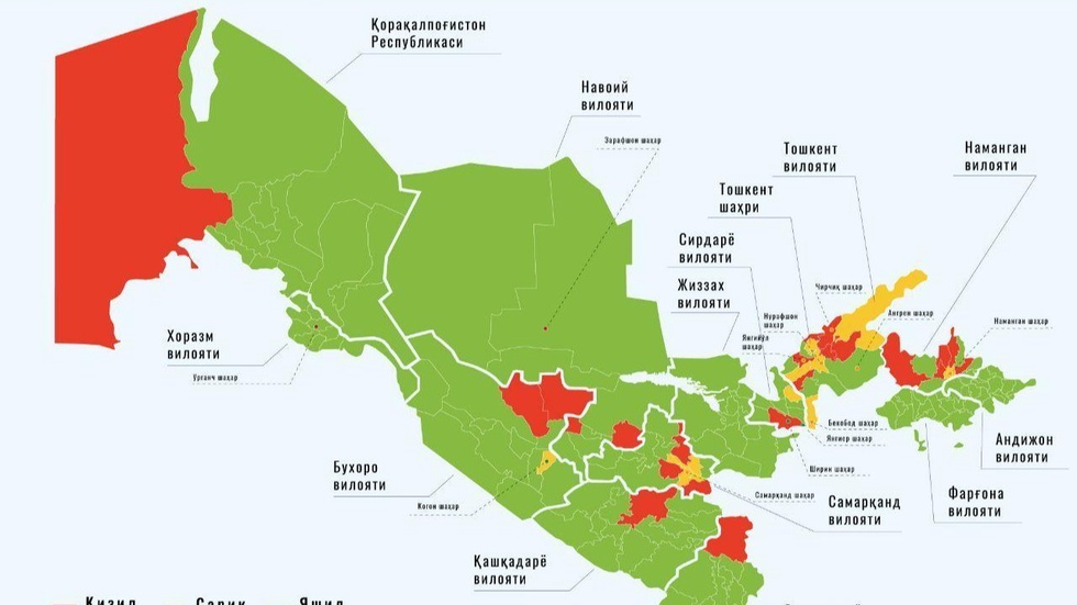 Қизил ҳудудлар, асосан, Тошкент ва Наманган вилоятларида қайд этилган бўлса, Тошкент шаҳри, Тошкент ва Самарқанд вилоятларининг туман ва шаҳарлари энг кўп сариқ ҳудуд деб топилди.