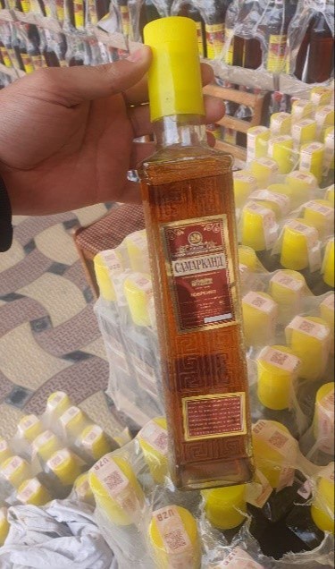 Бош прокуратура ҳузуридаги Департаментнинг Самарқанд вилоят бошқармаси ва ИИБ ЖҚБ ходимлари ҳамкорлигида ўтказилган тезкор тадбирда, Самарқанд тумани “Қозиариқ” маҳалласидаги хонадонлардан бирида яшовчи З.У. ўз уйи омборхонасида қалбаки акциз маркалар билан елимланган 25 000 дона “Водка Русская премиум” номли ароғини, 9 000 дона “Самарқанд” коньягини, 8 760 дона “Портвейн 53” номли виносини ҳамда 468 дона “Старый  Самарканд” номли коньягини сотиш мақсадида сақлаб келаётганлиги аниқланган.