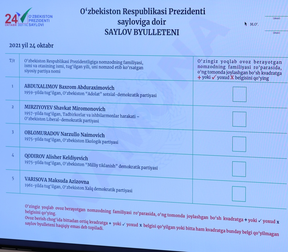 Сайлов кодексининг 31-моддасига мувофиқ, Ўзбекистон Республикаси Президенти сайловига доир сайлов бюллетенининг шакли ва матни Марказий сайлов комиссияси томонидан тасдиқланади. Сайлов бюллетенида уни тўлдириш тартиби тўғрисидаги тушунтириш бўлиши керак.