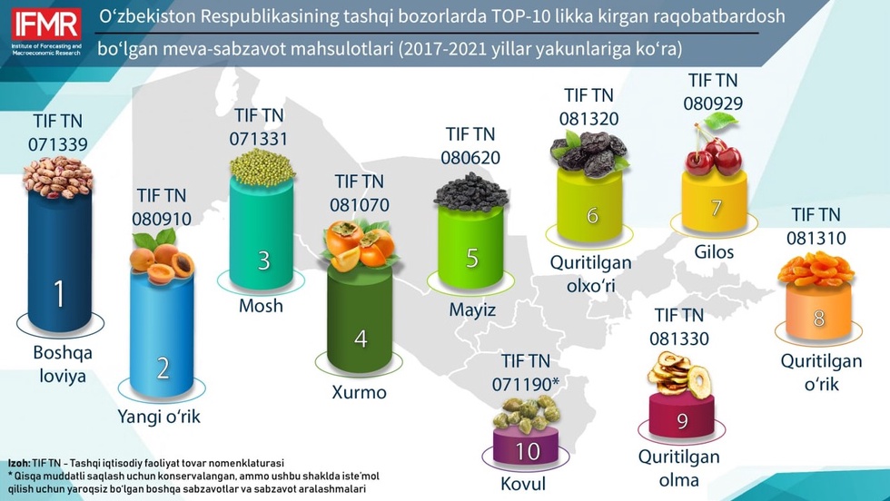 2017-2021 йилларда жаҳон бозорида энг катта қиёсий устунликка эга бўлган маҳсулотлар 10 талигига ловия, ўрик, хурмо, майиз, олхўри қоқи, гилос, туршак, олма қоқи, қисқа муддат сақлаш учун мўлжаллаб консерваланган, лекин бу шаклда озуқа сифатида истеъмол қилиш учун яроқсиз бўлган бошқа сабзавот ва ўсимлик аралашмалари киради.
