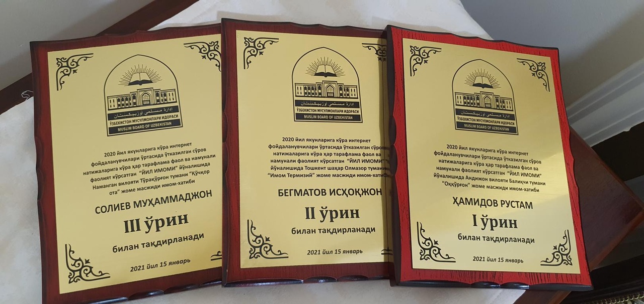 Бугун, 10 март куни Ўзбекистон мусулмонлари идорасида интернет кузатувчилари ўртасида ўтказилган “Йил танлови – 2020” ғолибларини тақдирлаш маросими бўлиб ўтди. Унда Ўзбекистон мусулмонлар идораси раиси ўринбосари Иброҳимжон Иномов, Диний идора масъул ходимлари, имом домлалар ва меҳмонлар қатнашди.