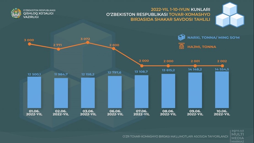 2022 йил июнь ойининг дастлабки ўн кунлигида Республика Товар-хомашё биржаларида сотилган шакарнинг минимал баҳоси бир тонна маҳсулот учун 11 984,7 минг сўмни, максимал нархи 14 554,5 минг сўмни ташкил этди ва ўртача нарх эса 13 108,4 минг сўмдан тўғри келди.
