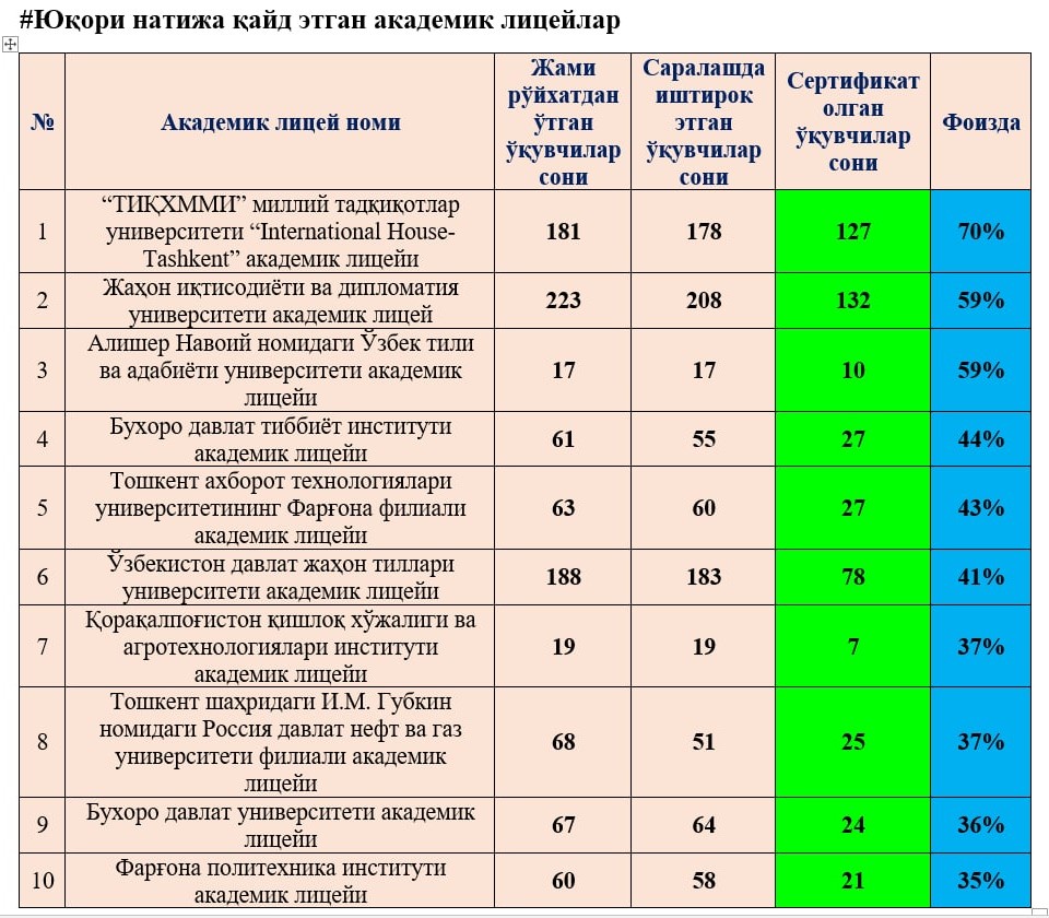 Унда иштирок этиш учун махсус электрон платформадан рўйхатдан ўтиб, имтиҳонда қатнашган 4065 нафар академик лицей ўқувчиларидан 1 226 нафари В2 сертификатига эга бўлишди. Ушбу кўрсаткич 2020/2021 ўқув йилига нисбатан икки баробарга ортган.