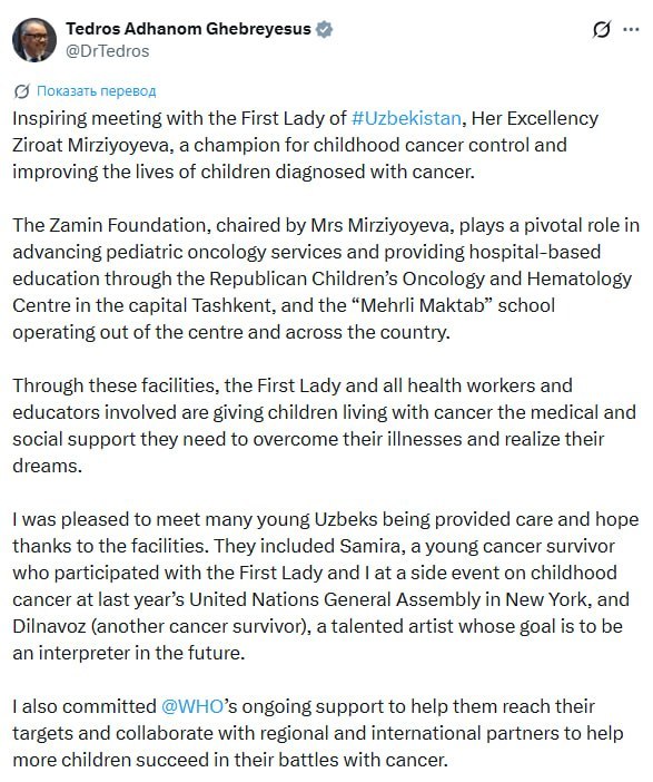Шунингдек, ташрифдан сўнг ЖССТ Бош директори Доктор Тедрос Гебрейесус ўзининг Х (Twitter) саҳифасида Ўзбекистон Биринчи хоними Зироат Мирзиёева билан учрашув таассуротлари ҳақида бўлишди.