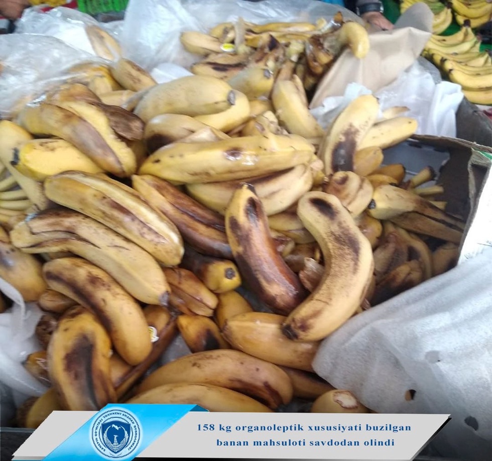 Мазкур профилактик рейд тадбирлари давдомида органолептик хусусияти бузилган 158 кг миқдорда банан меваси истеъмолга яроқсизлиги боис тегишли тартибда савдодан олинди ва ўрнатилган тартибда бракераж қилинди.
