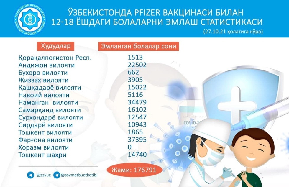 27 октябрь ҳолатига кўра, юртимизда 176 791 нафар 12 ёшдан 18 ёшгача бўлган болалар Pfizer вакцинаси билан ихтиёрий равишда эмланди.
