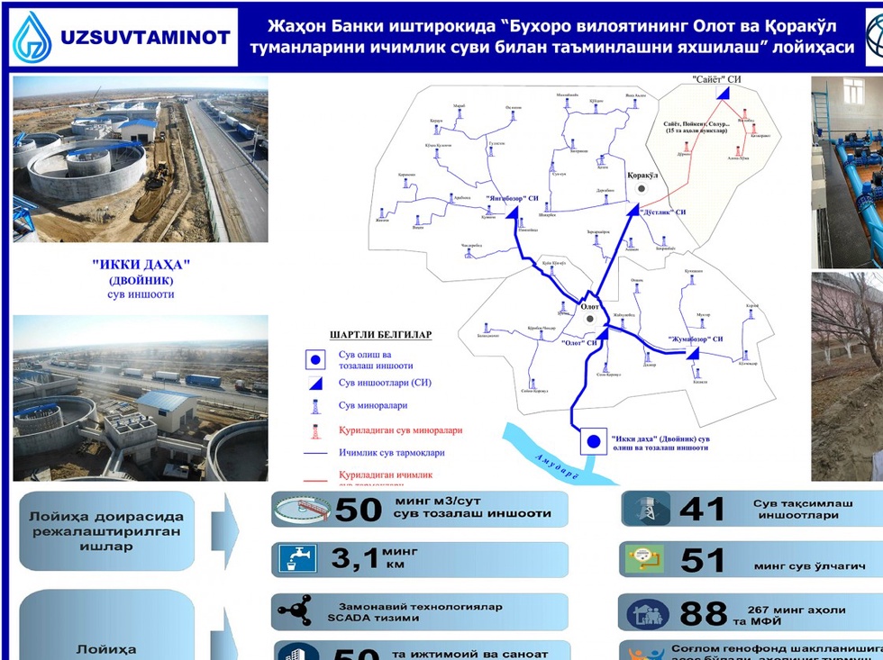 51 мингта сув ҳисоблагичи ўрнатилиб, тизимда замонавий СCАДА технологиясидан фойдаланилади. 50 та ижтимоий ва саноат объекти сув билан таъминланади.