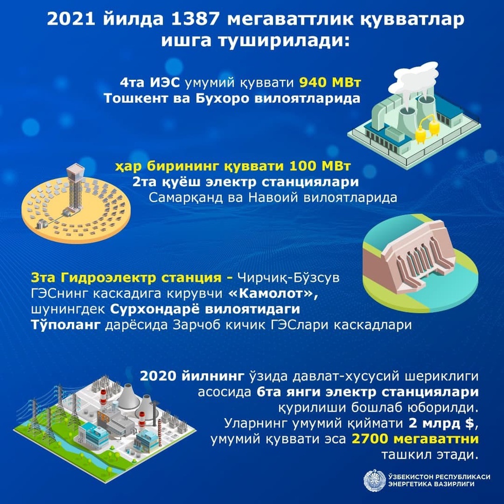 2021 йилда қуввати 1 387 мегаватт бўлган қувватлар ишга туширилади