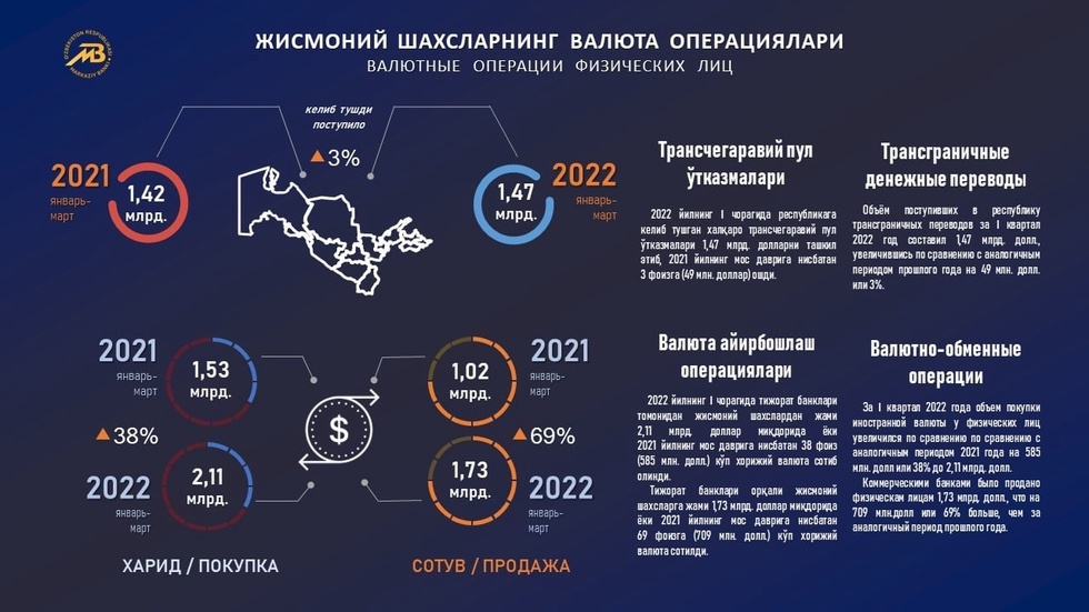 Амалга оширилган трансчегаравий пул ўтказмалари ҳажми ўтган йилнинг шу даврига нисбатан 3 фоизга ошган (1,42 млрд. АҚШ доллар).