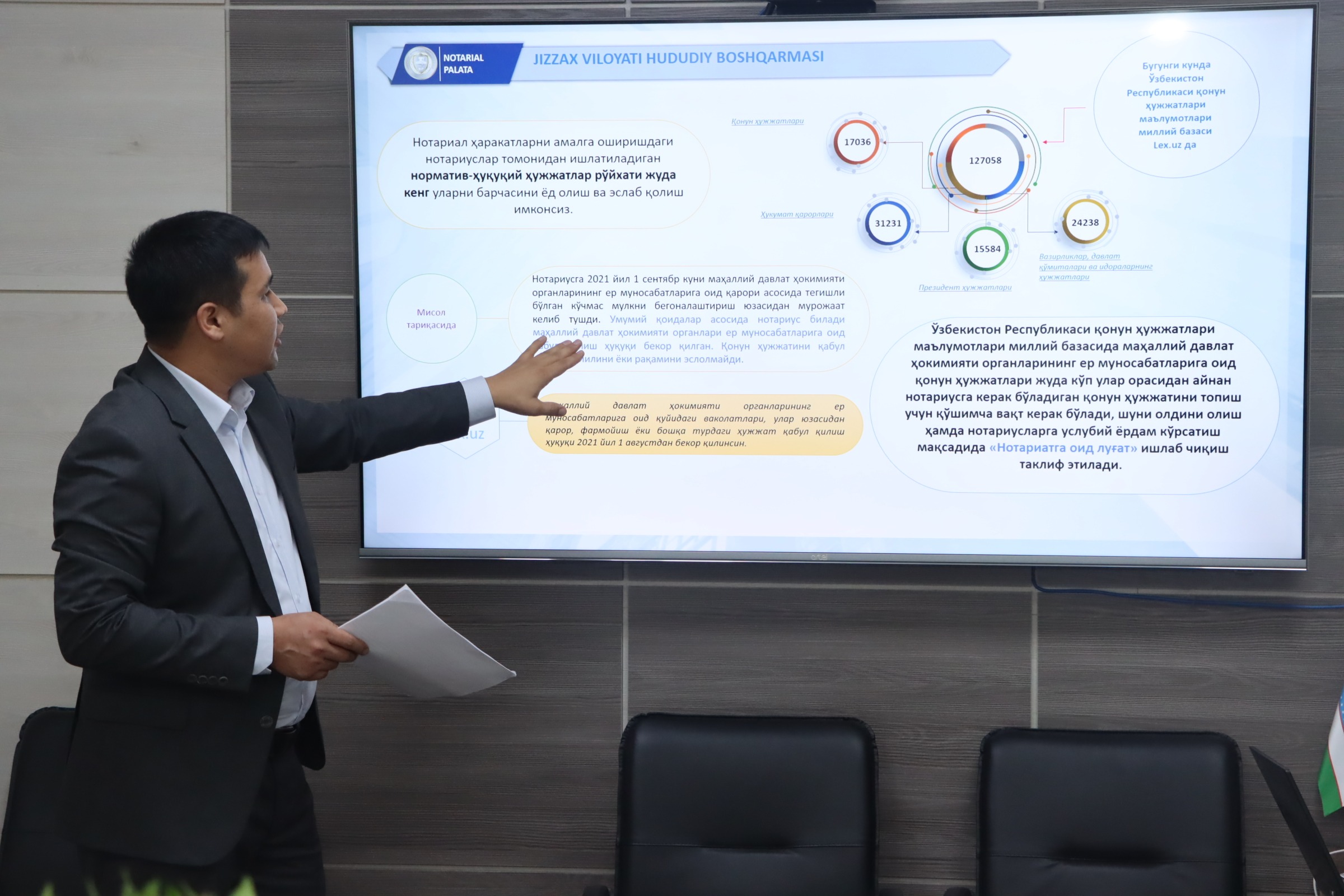 Айтиш жоизки, Ўзбекистон Республикаси Нотариал палатаси келаси йилнинг январь ойида 4 ёшга тўлади. Бугунги кунда Палатага аъзо бўлган хусусий амалиёт билан шуғулланувчи нотариуслар сони 1000 нафарга яқинлашиб қолди. Палата раиси Дилшод Ашуров тадбирда сўзлаган кириш сўзида фаол ва қонун доирасида фаолият юритаётган нотариусларни ҳар томонлама қўллаб-қувватлаш, қонун ва нормаларга риоя этган ҳолда аҳолига юксак савияда ҳуқуқий хизмат кўрсатаётган нотариусларни рағбатлантириб бориш, нотариат соҳасида Ўзбекистон амалиётини хорижга олиб чиқиш орқали мамлакат нуфузи яхшиланишига ҳисса қўшиш Палатанинг ўз олдига қўйган мақсадларидан бири эканлигини таъкидлаб ўтди.