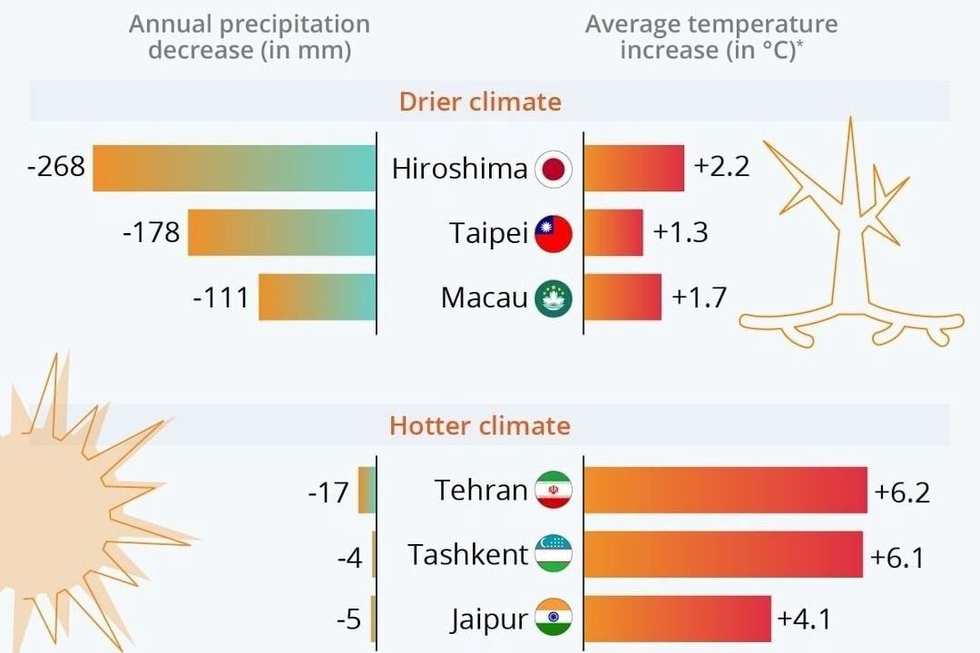22 % шаҳарларда 30 йилдан сўнг кутиладиган иқлим шароити ҳозирги мавжуд биронта шаҳар иқлимини такрорламаскан. Чорак асрдан сўнг Москва иқлими Софияга, Лондон ҳавоси Барселонага, Мадрид иқлими ҳозирги Марокаш иқлимига ўхшаб кетади.