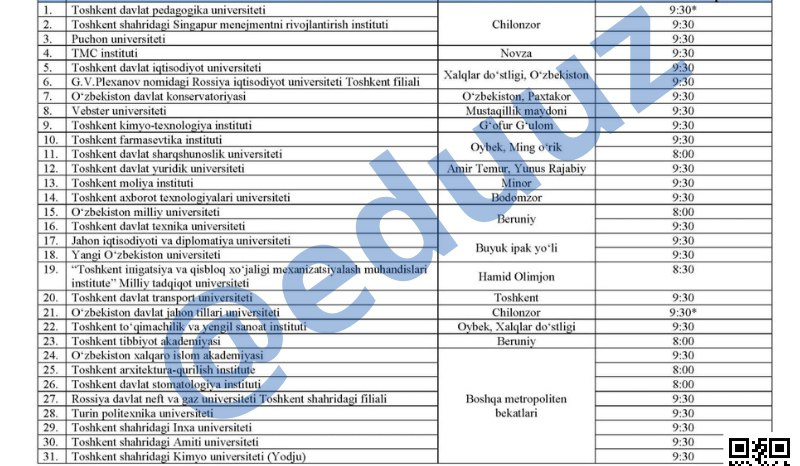 Пойтахт метрополитенида йўловчи оқимини тўғри тақсимлаш, талабаларнинг ўз вақтида дарс машғулотларига етиб боришлари учун қулайлик яратиш мақсадида бекатларга яқин жойлашган олий таълим муассасаларининг мақбуллаштирилган иш графиги тасдиқланди.