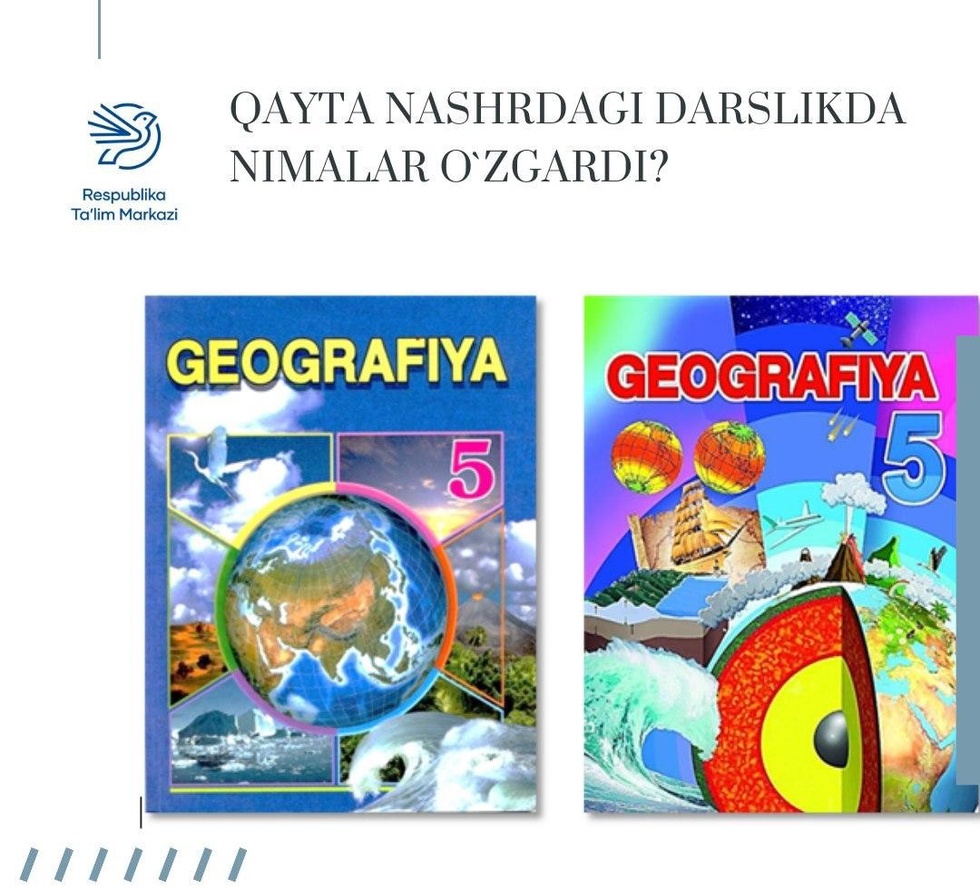 5-синф «География (Табиий география бошланғич курси)» дарслигидаги ўзгаришларни китобни қўлга олган заҳоти сезиш мумкин. Дарсликнинг муқовасидан тортиб мавзулардаги кўплаб иллюстрацияларгача замонавий расмлар билан алмаштирилган.