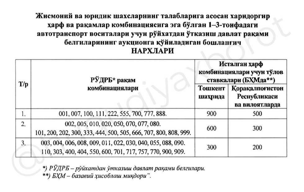 - 1 ва 2-тоифадаги рақамлар мос равишда 2 ва 3-тоифаларга доир бошланғич нархларда аукционга қўйилади (ҳарфлари бир хил комбинацияда бўлган рақамлардан ташқари);