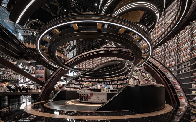 Одамлар ҳалқалар фонида кичкина кўринади. Безатишда асосан қора рангдаги ёғоч ва мармар фойдаланилган, дўкондаги шифт ойнаванд қилиб ишланган бўлиб, бу хонани визуал тарзда кенгроқ қилиб кўрсатади. Шунингдек, дўкон ичида қаҳвахона, болалар ўйин майдончаси ва ўқиш зали учун жой ҳам бор, деб хабар беради techcult.ru.