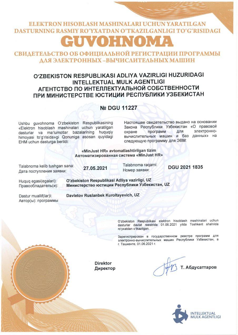 Адлия вазирлигининг “MinJust HR” автоматлаштирилган тизими муаллифлик ҳуқуқи сифатида Интеллектал мулк агентлигидан расмий рўйхатдан ўтказилди ва белгиланган шаклдаги гувоҳнома олинди.